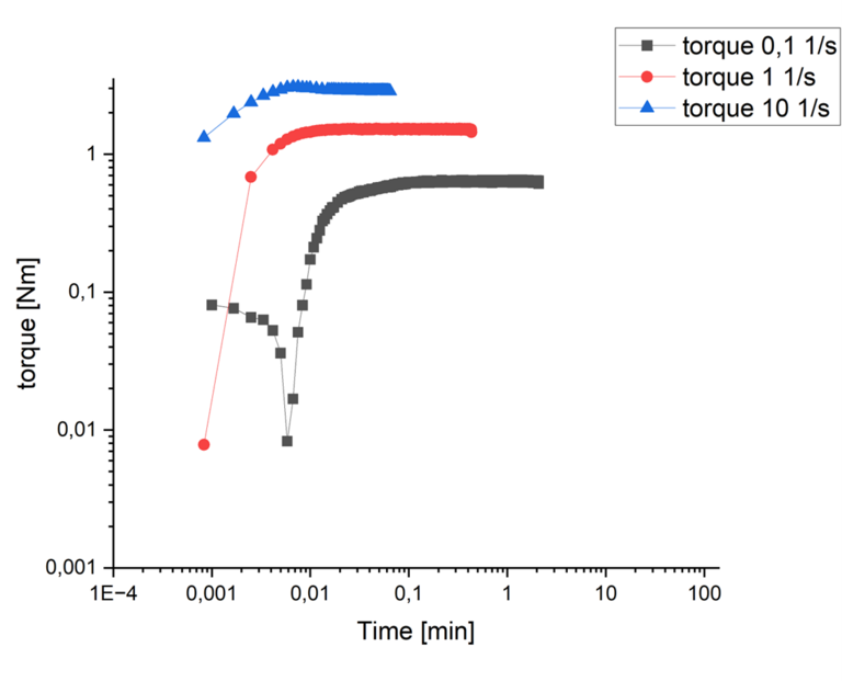 Die Messung erfolgt hier über eine sprunghafte Änderung der Winkelgeschwindigkeit bzw. der Schergeschwindigkeit und wird auch als Spannversuch bezeichnet. Als Antwort aus der Vorgabe der Schergeschwindigkeit erhält man das Drehmoment und damit die Schubspannung über der Zeit. Die Viskositäten erreichen ein Gleichgewicht nach genügend langer Zeit, wie in Bild 1 dargestellt.