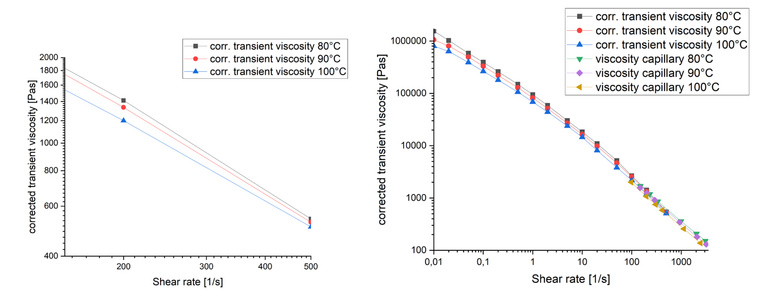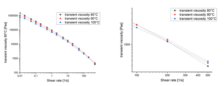 Bild 4 zeigt die Abhängigkeit der transienten Viskosität von der Prüftemperatur. Wird die Dissipation nicht berücksichtigt kann die Viskosität bei tieferer Temperatur aufgrund der hohen Dissipation wie in diesem Beispiel tiefer als bei höherer Prüftemperatur liegen. Die unkorrigierten Daten bei 80°C liegen in diesem Beispiel unterhalb der Werte von 90°C und 100°C. Bei einem Temperatur-Shift würden diese Daten daher nicht berücksichtigt.