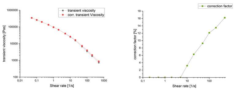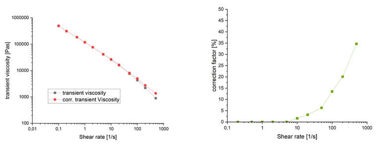 Bild 2 zeigt einen Vergleich der Messung der transienten Viskosität mit und ohne Berücksichtigung der Schererwärmung für ein hochviskoses EPDM Compound. In der unkorrigierten Viskositätskurve zeigt sich ein Abknicken. Die Temperaturerhöhung der Probe reduziert die Viskosität in diesem Beispiel um bis zu 40%.