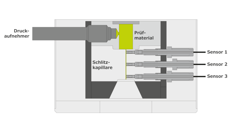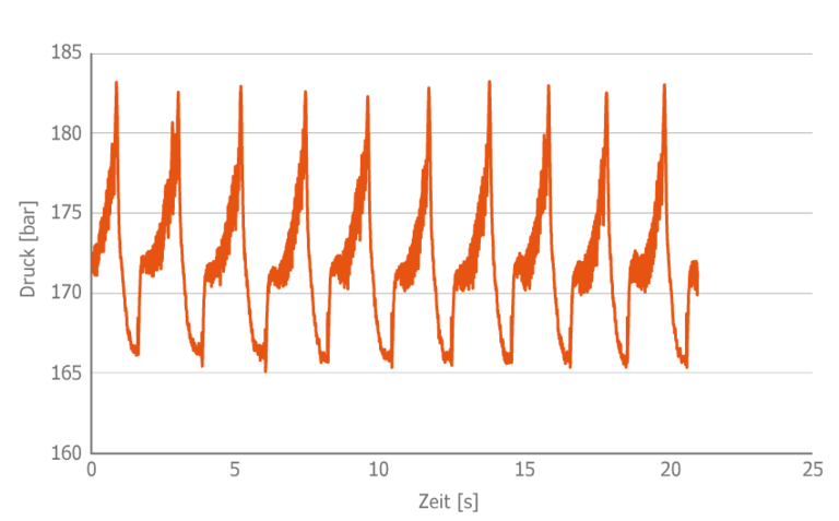 Die folgenden Abbildungen zeigen einen Vergleich zwischen der konventionellen Druckmessung mit einer Abtastrate von maximal 10 Hz vor der Kapillare und einer hochfrequenten Druckmessung von bis zu 20 kHz in der Schlitzdüse am gleichen Material.