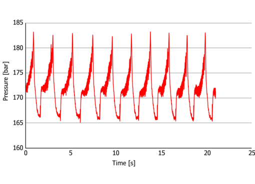 Das dargestellte Beispiel im Slip-Stick-Bereich zeigt, dass Amplitude und Frequenz bei konventionellen Messungen aufgrund unzureichender Zeit- und Druckauflösung nicht korrekt wiedergegeben werden. Fließinstabilitäten lassen sich daher mit herkömmlichen Druckaufnehmern nur eingeschränkt untersuchen. Mit der hochfrequenten Druckmessung hingegen kann ein regelmäßiger pulsierender Druckanstieg mit überlagerten hochfrequenten Druckoszillationen erfasst werden. Die jeweiligen Einzelfrequenzen und Amplituden werden aus dem Drucksignal mittels nachgeschalteter Fourier-Transformation bestimmt. Die so ermittelten Frequenzen stimmen exakt mit den Frequenzen überein, die aus der Defektlänge auf der Strangoberfläche und der jeweiligen Extrusionsgeschwindigkeit berechnet werden. Das entsprechende Frequenzspektrum zeigt die jeweiligen Amplituden des aufgezeichneten Drucksignals. Der Peak bei einer Frequenz von null Hertz entspricht exakt dem statischen Drucksignal.
