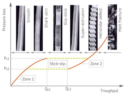 Bei niedrigen Scherraten ist das Profil zunächst glatt. Mit zunehmender Scherung tritt Shark-Skin-Bildung auf der Oberfläche auf, begleitet von häufigeren Druckschwankungen. Bei weiterer Erhöhung der Scherrate entstehen Slip-Stick-Effekte, die durch partielles Gleiten der Schmelze gekennzeichnet sind. Wird die Verformung bzw. Scherrate weiter gesteigert, kann in einem sehr engen Scherratenbereich erneut ein glatteres Extrudat erzielt werden. Das Extrusionsverhalten in diesem Bereich nennt man Super-Extrusion. Nach dem Durchlaufen eines Bereichs mit helixartigen Strukturen tritt schließlich Schmelzebruch auf, verbunden mit einem deutlichen Verlust der ursprünglichen Geometrie.