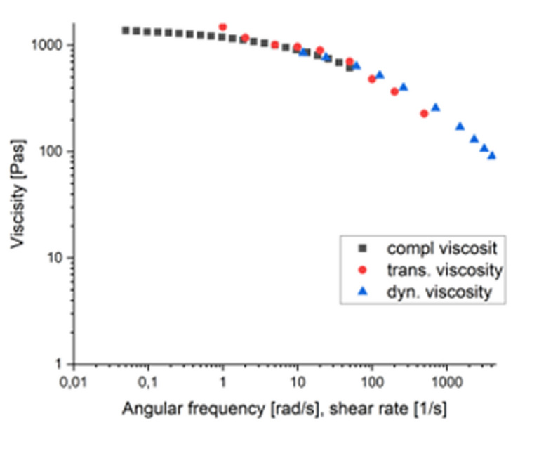 Zum Nachweis der Gültigkeit Cox-Merz-Beziehung, wurde die transiente Viskosität mit dem ROR bestimmt. Abbildung links zeigt Daten der transienten Viskosität des ROR, der komplexen Viskosität eines Rotations-Laborrheometers (oszillatorischer Modus) sowie der dynamischen Viskosität aus einem Kapillarrheometer (stationäre Deformation). Im untersuchten Bereich überlagern sich die Daten aller drei Geräte auf einer einheitlichen Masterkurve, was die Annahme der Gültigkeit der Cox-Mertz Beziehung für dieses Material bestätigt.